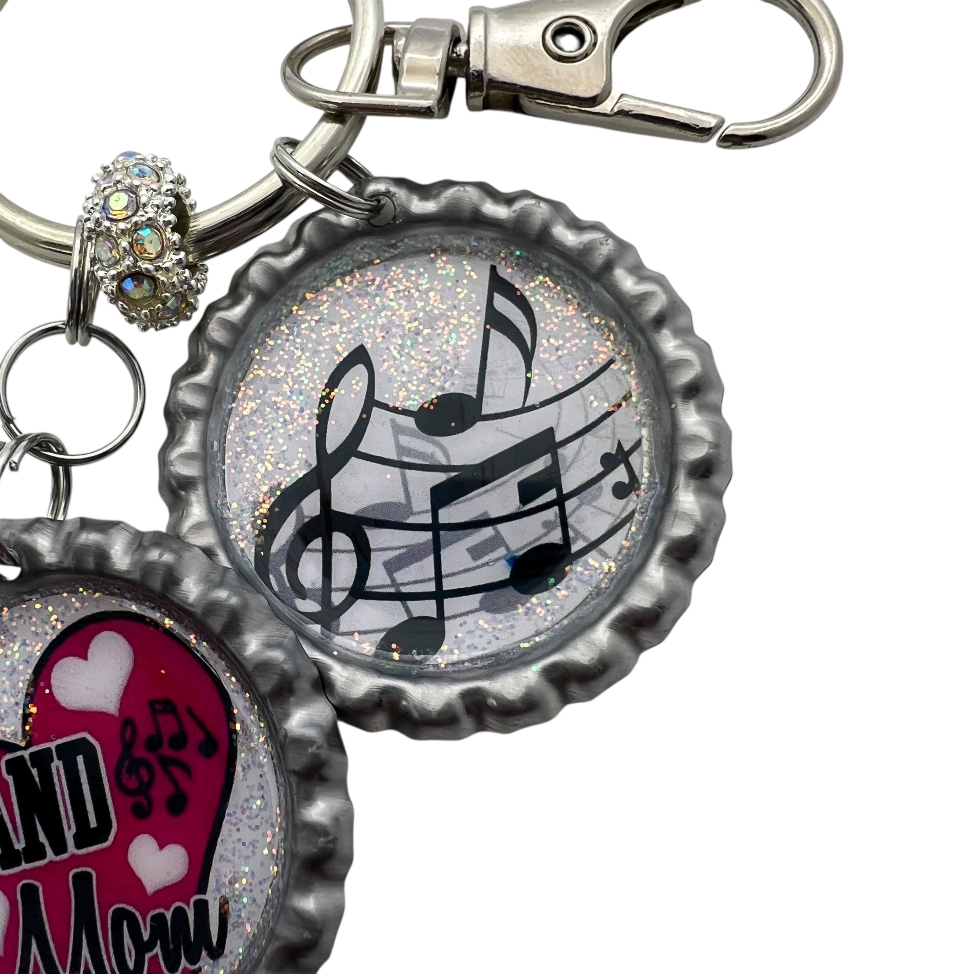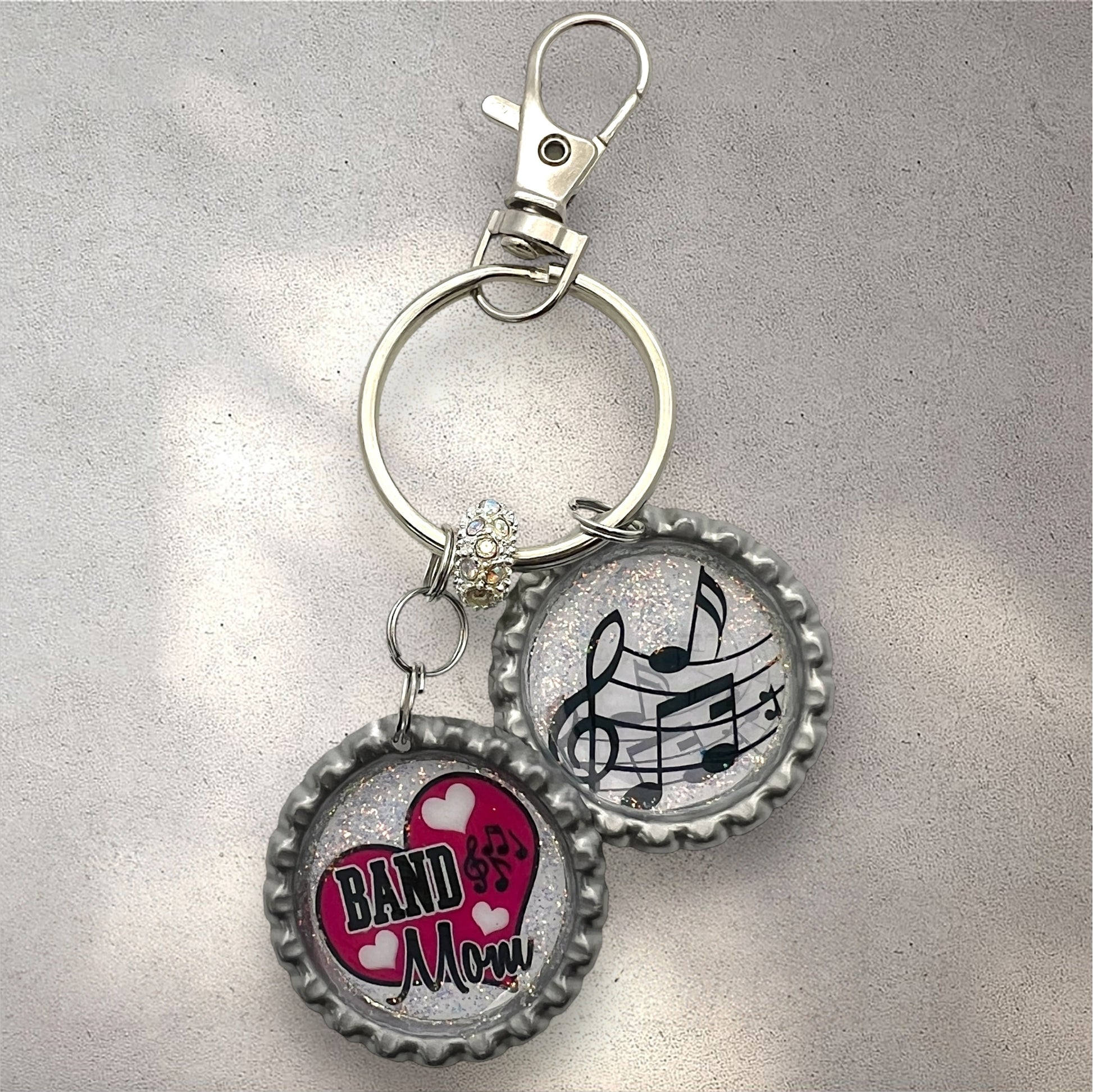 Band Mom Keychain with Music Notes – Glitter Resin Bottle Cap Keyring Gift