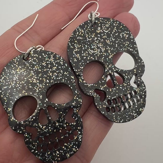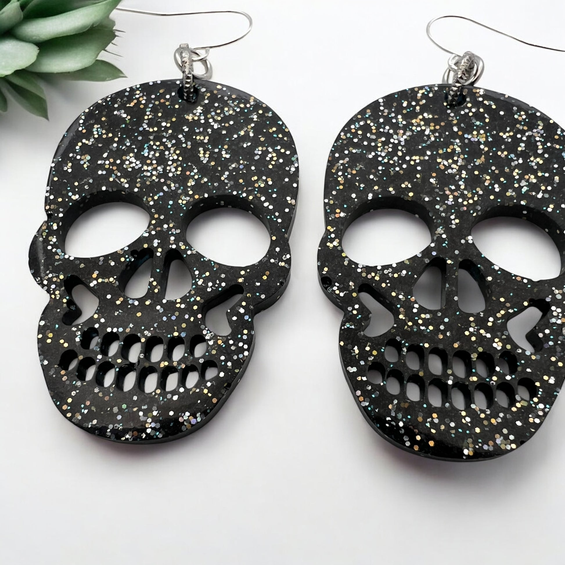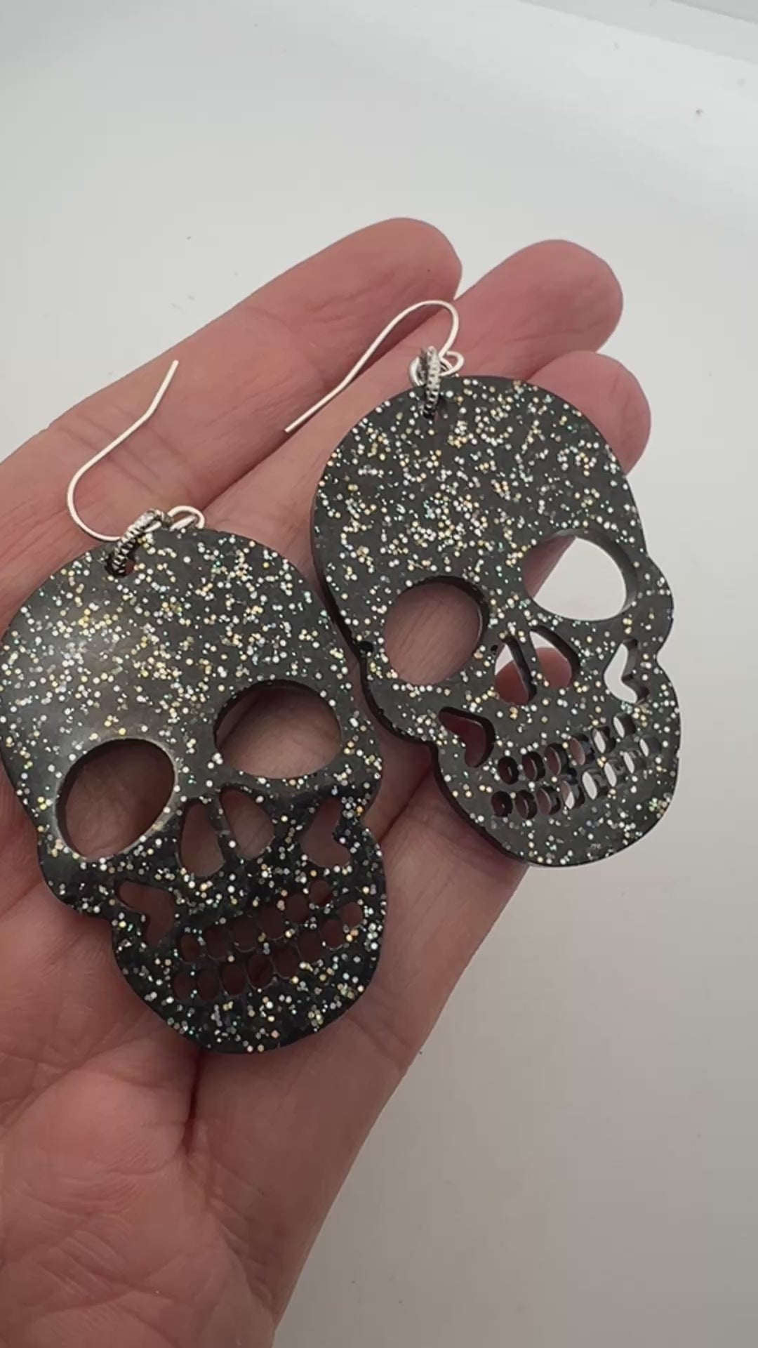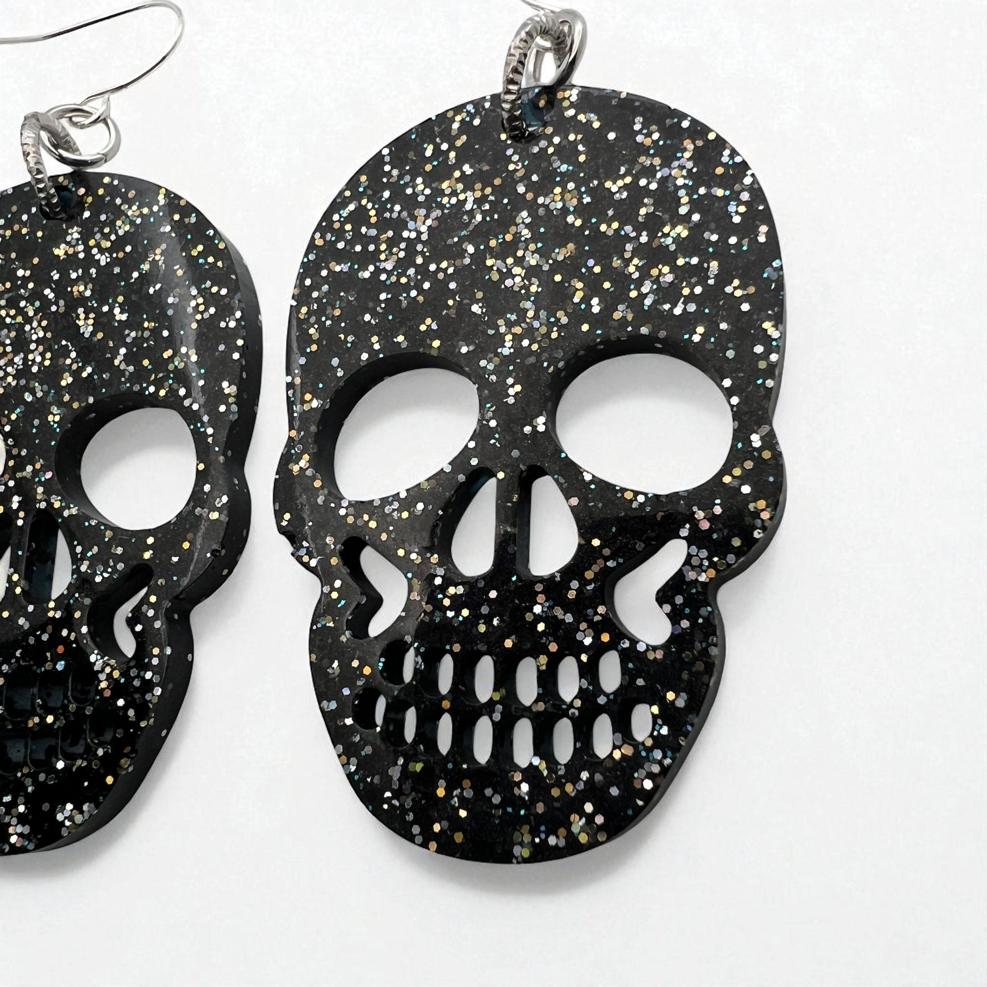Add a bold sparkle to your spooky style with these resin glitter skull earrings! Handmade from black resin with shimmering silver glitter, these lightweight statement dangles measure 2 inches long and feature detailed cut-out skull designs.