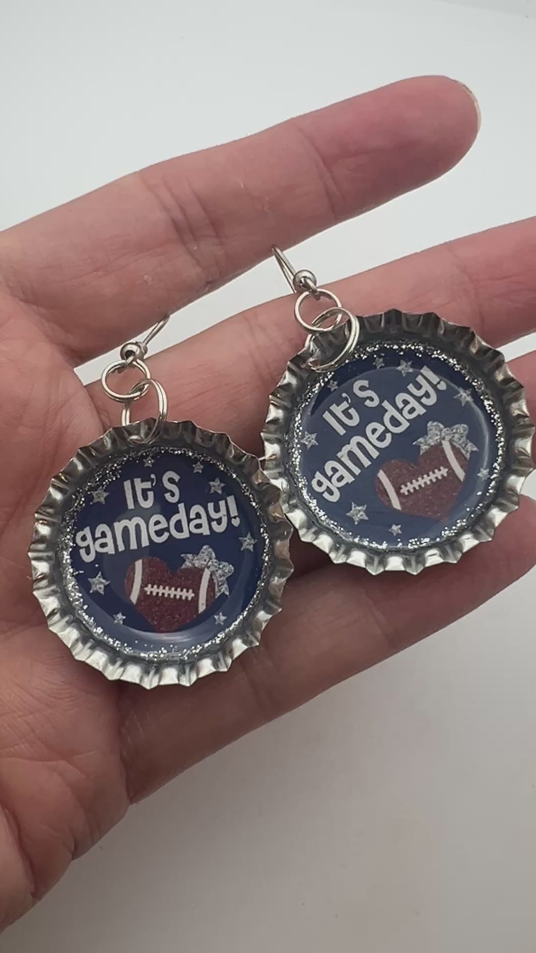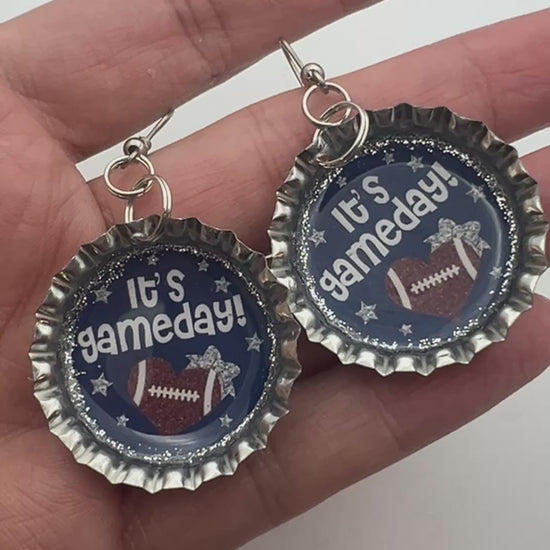 Bring your team spirit to life with these Blue and Silver Game Day Football Earrings. Handmade from repurposed bottle caps, each earring showcases a bold “It’s Gameday!” design with a football heart, silver glitter accents, and a glossy resin finish.