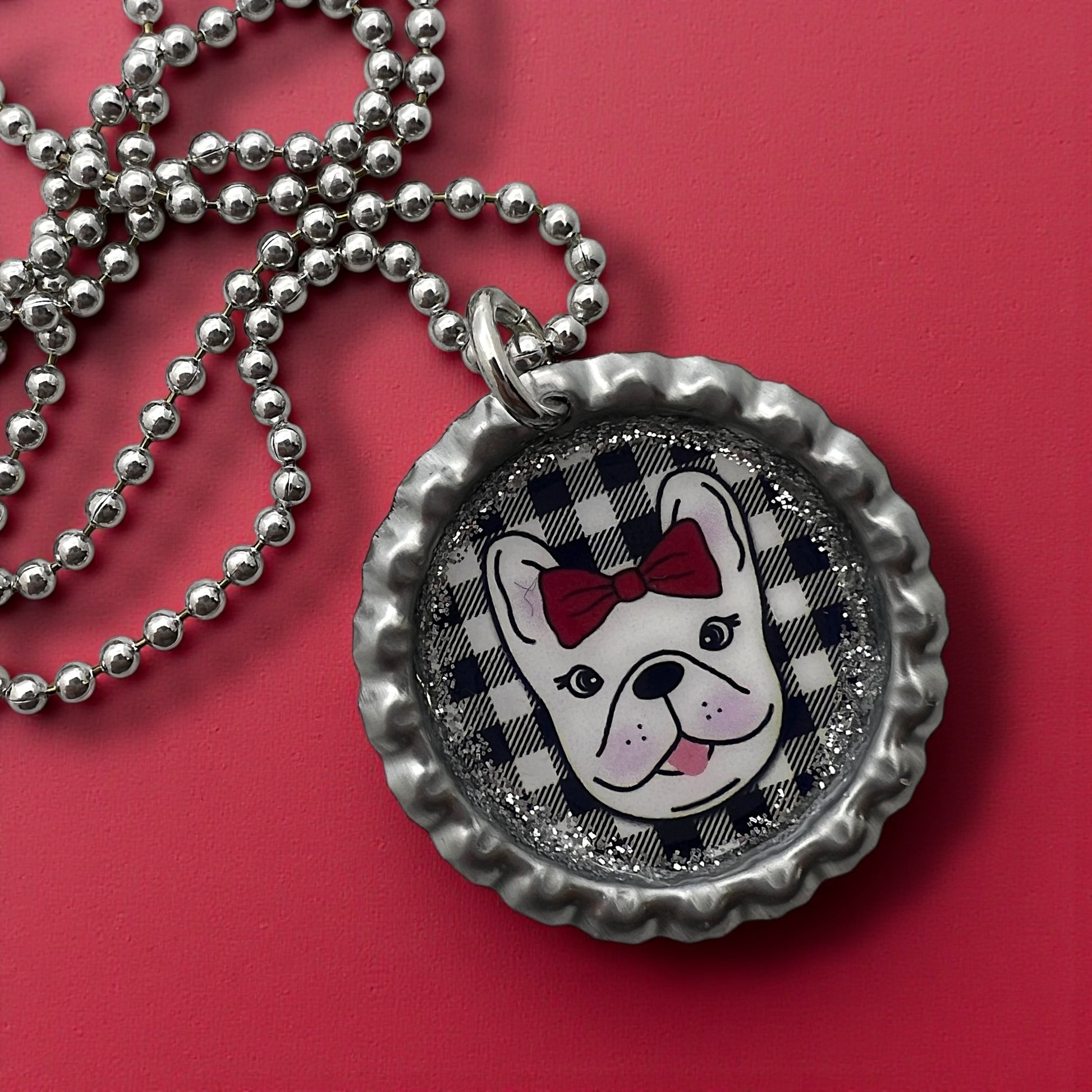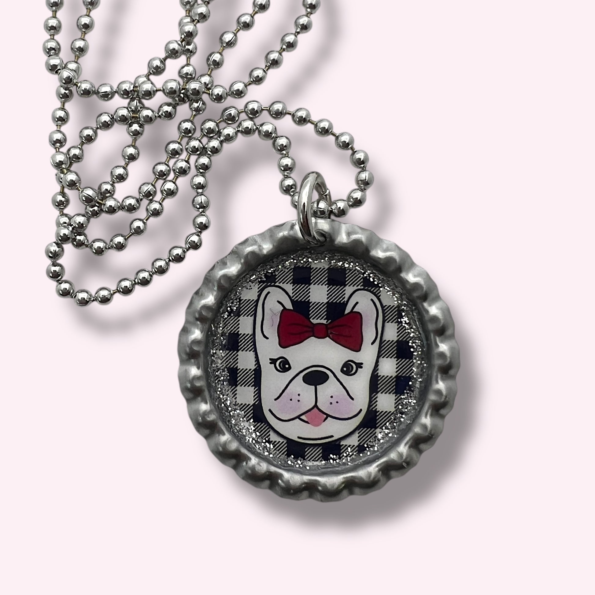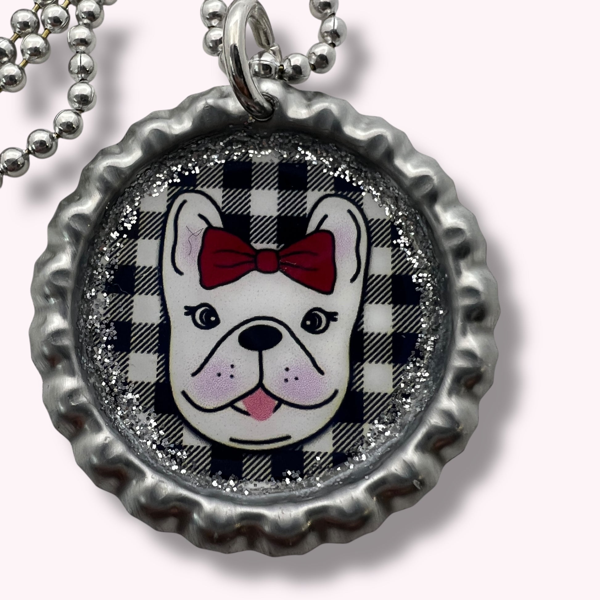 Add a playful, handcrafted touch to your accessories with this upcycled bottle cap necklace, featuring an adorable French Bulldog with a classic red bow on a black-and-white buffalo plaid background. Each pendant is made by hand in the Blue Diva Creations studio, sealed with glittery resin accents, and hung on a shiny ball-chain necklace for everyday wear.