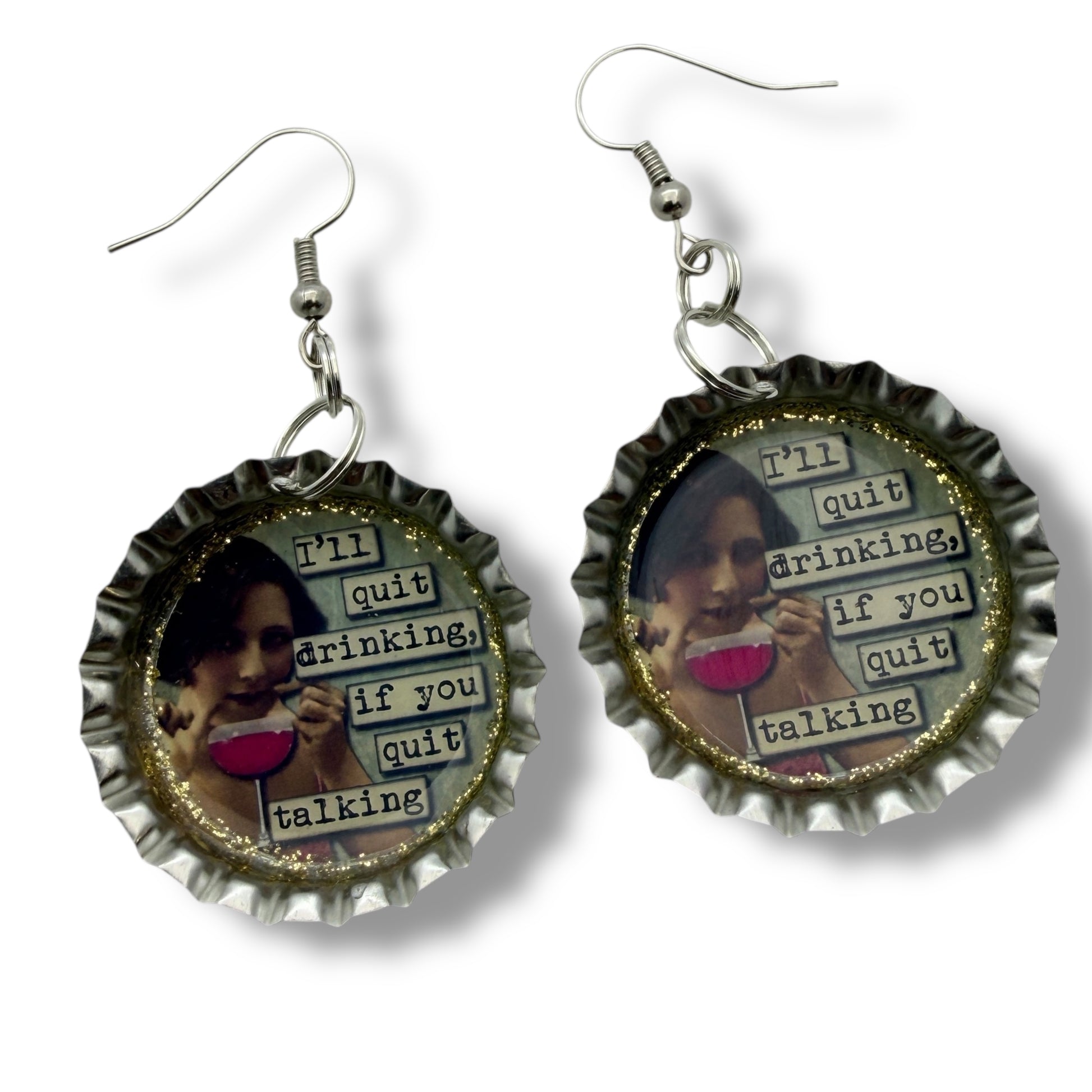 Funny Quote Bottle Cap Earrings – “I’ll Quit Drinking If You Quit Talking”