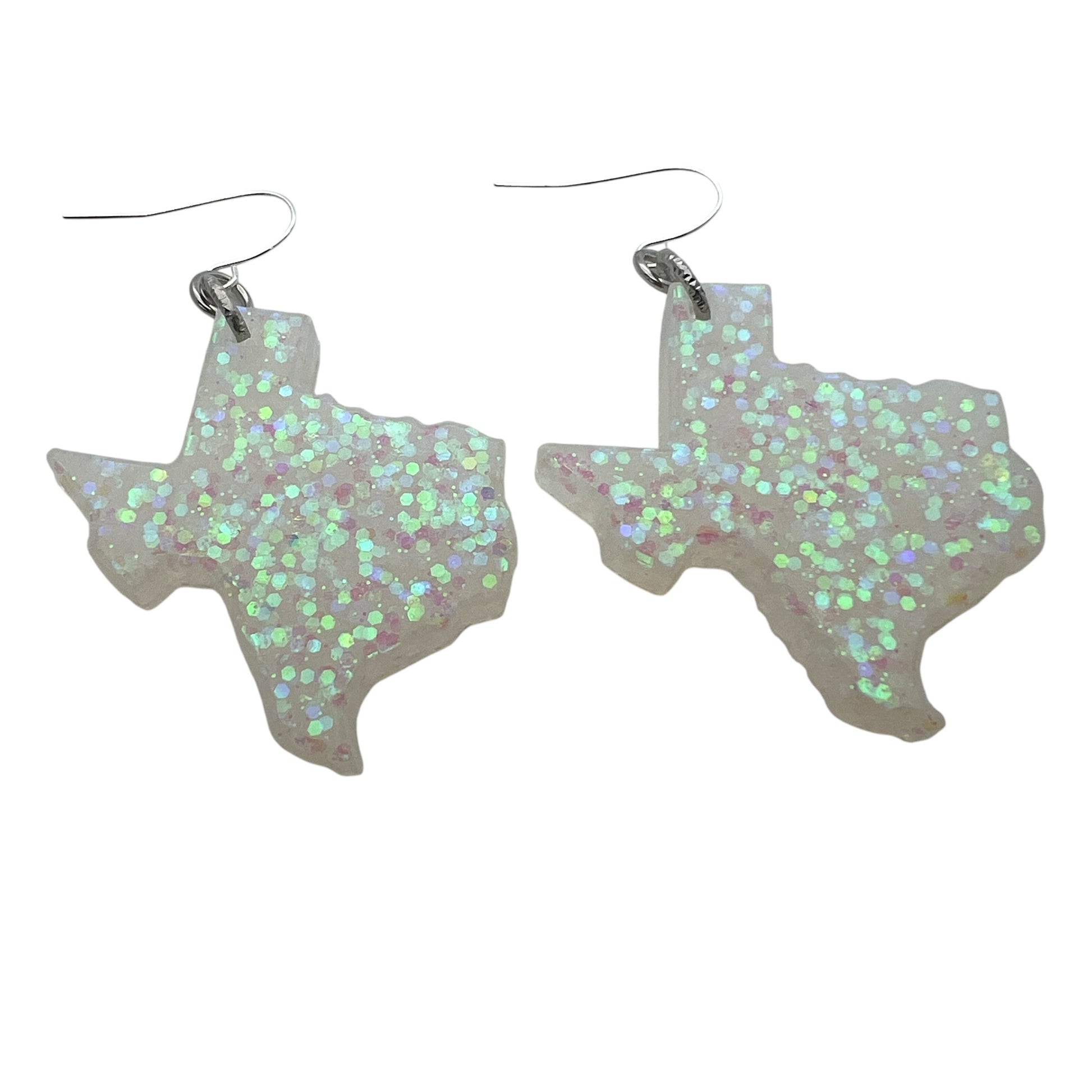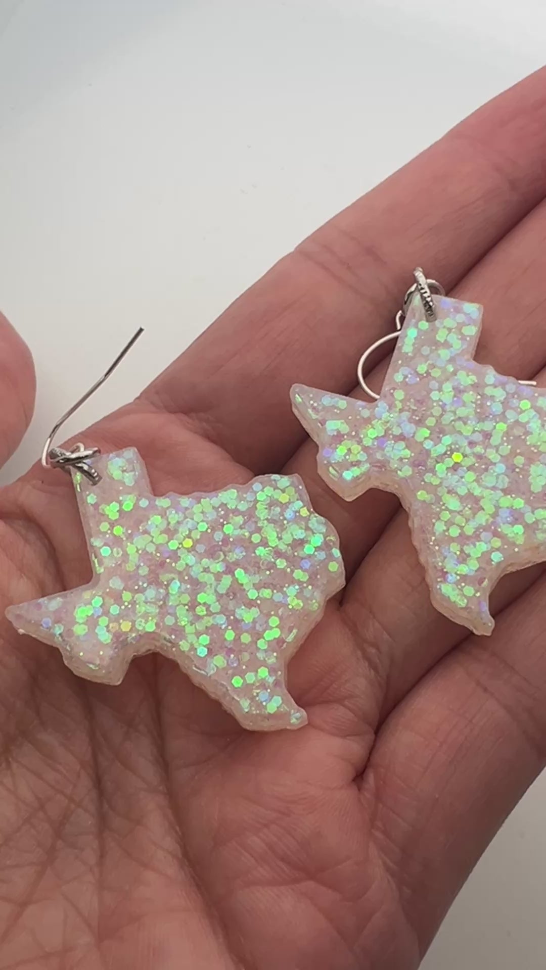 Show your Texas pride with these handmade resin earrings! Each pair is shaped like the state of Texas and filled with shimmering iridescent glitter that reflects pink and green tones in the light. Lightweight and eye-catching, they make the perfect accessory for everyday wear or special occasions.