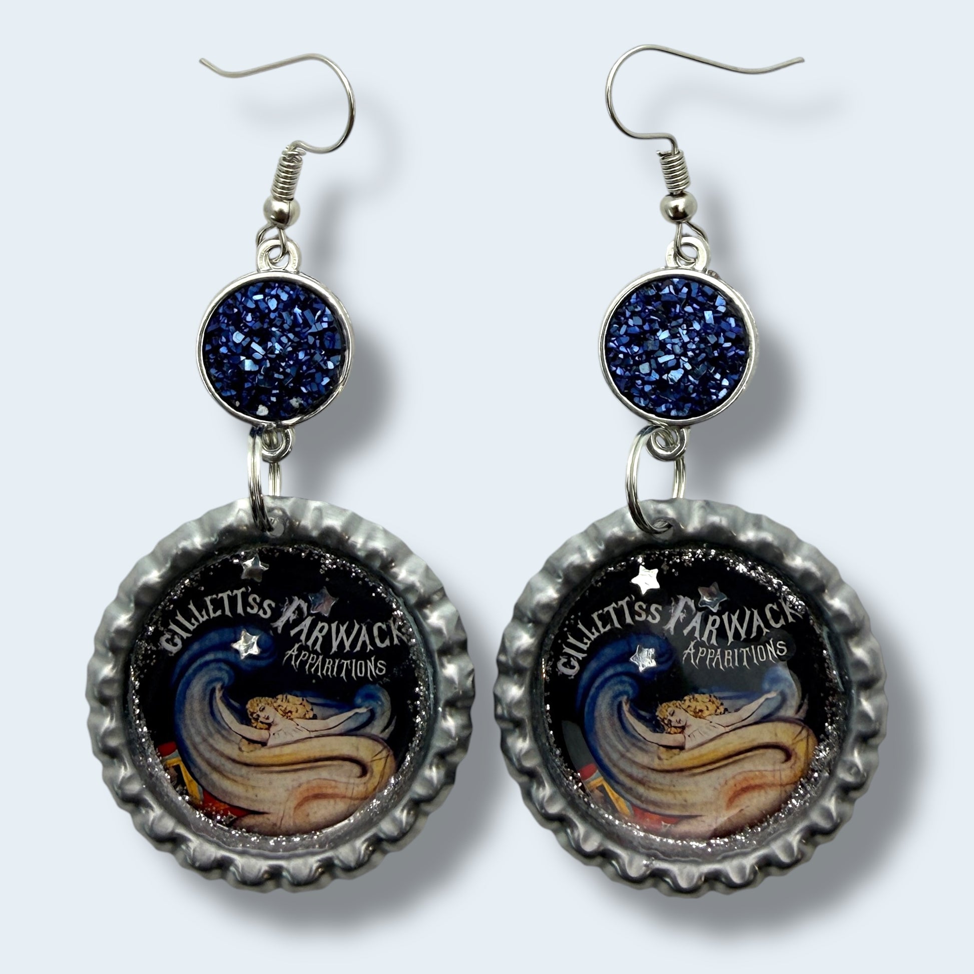 Bring a little midnight carnival magic to your look. These handmade statement earrings feature an upcycled bottle cap design with a gothic-inspired “Gilliett’s Parwack Apparitions” art image, accented with silver glitter and tiny star details. The navy faux druzy top adds rich texture and shimmer, while the resin seal gives a glossy, durable finish.