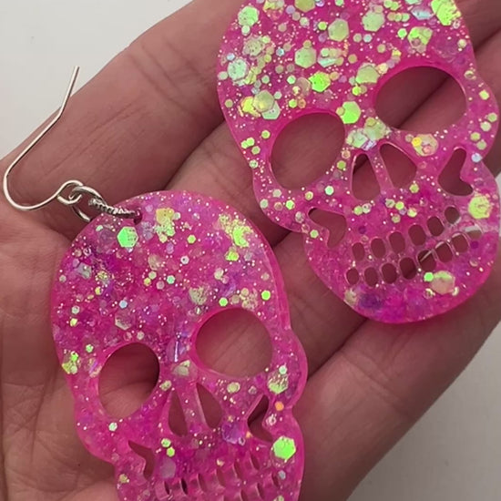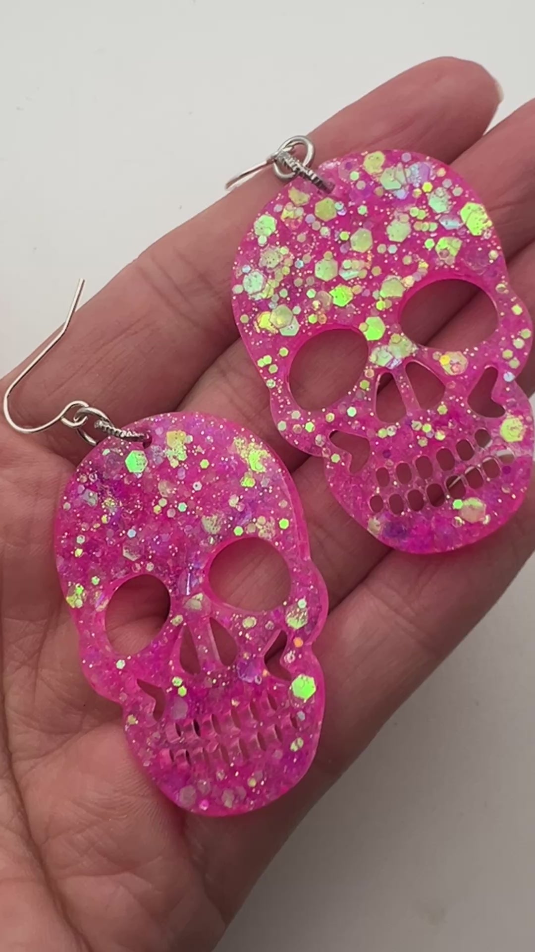 These 2-inch pink resin skull earrings are handmade with glitter and iridescent flakes that catch the light from every angle. Lightweight and comfortable, they make the perfect statement piece for Halloween, Día de los Muertos, or everyday bold style.