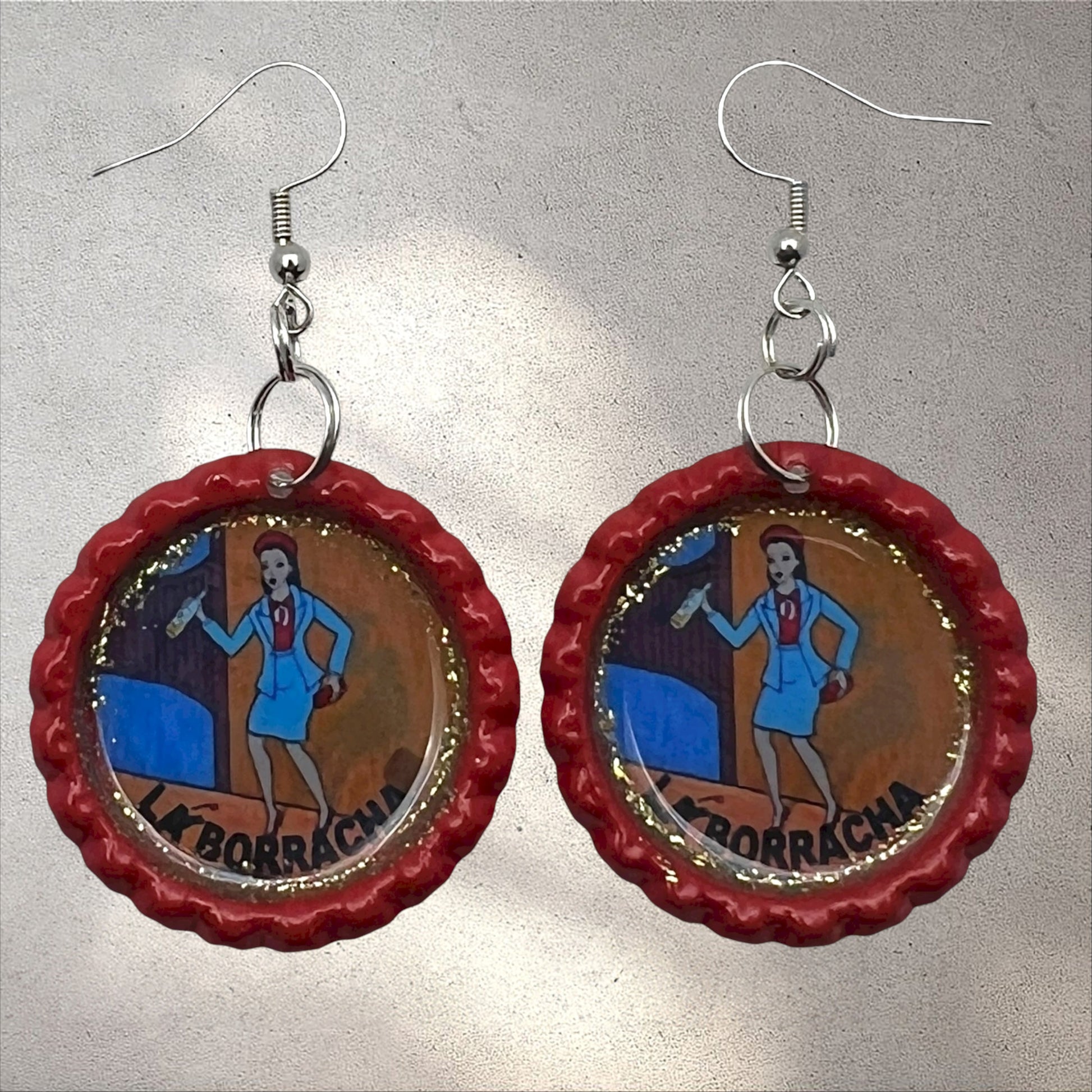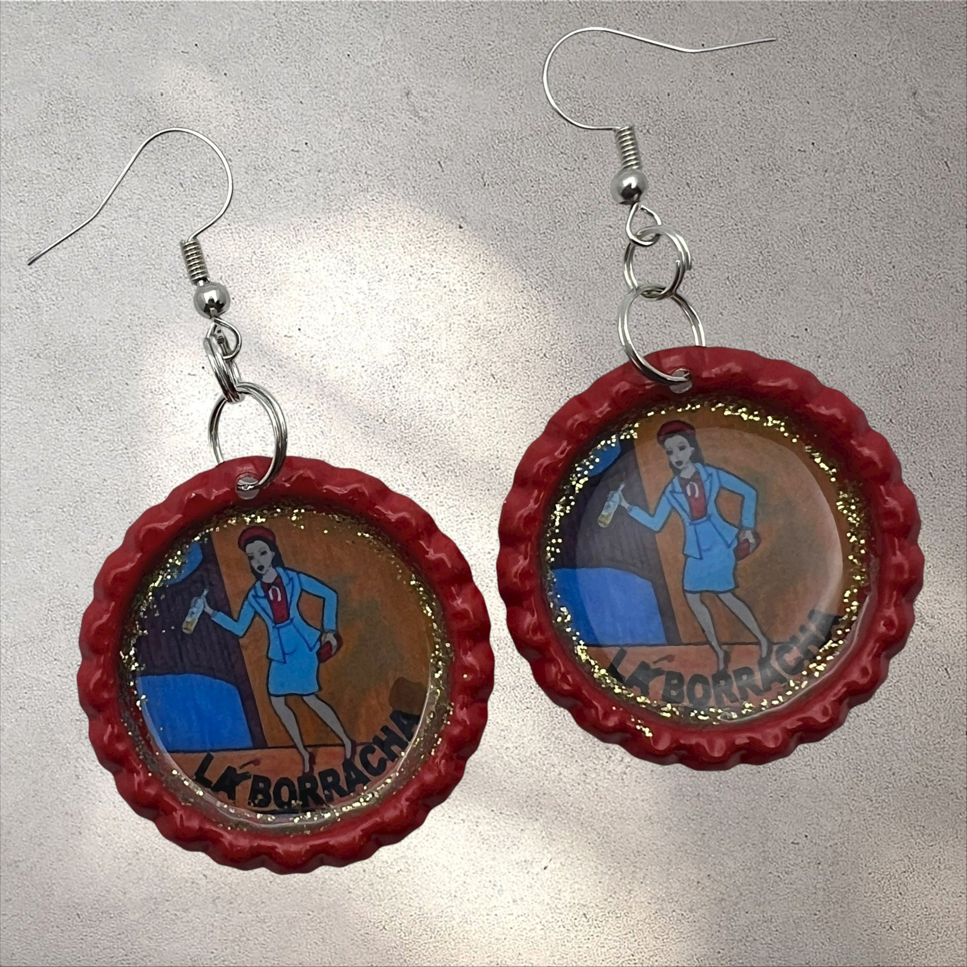 Bring playful energy and cultural flair to your style with these La Borracha earrings. Handmade from upcycled bottlecaps, each pair showcases the iconic “La Borracha” card from the beloved Mexican bingo game.