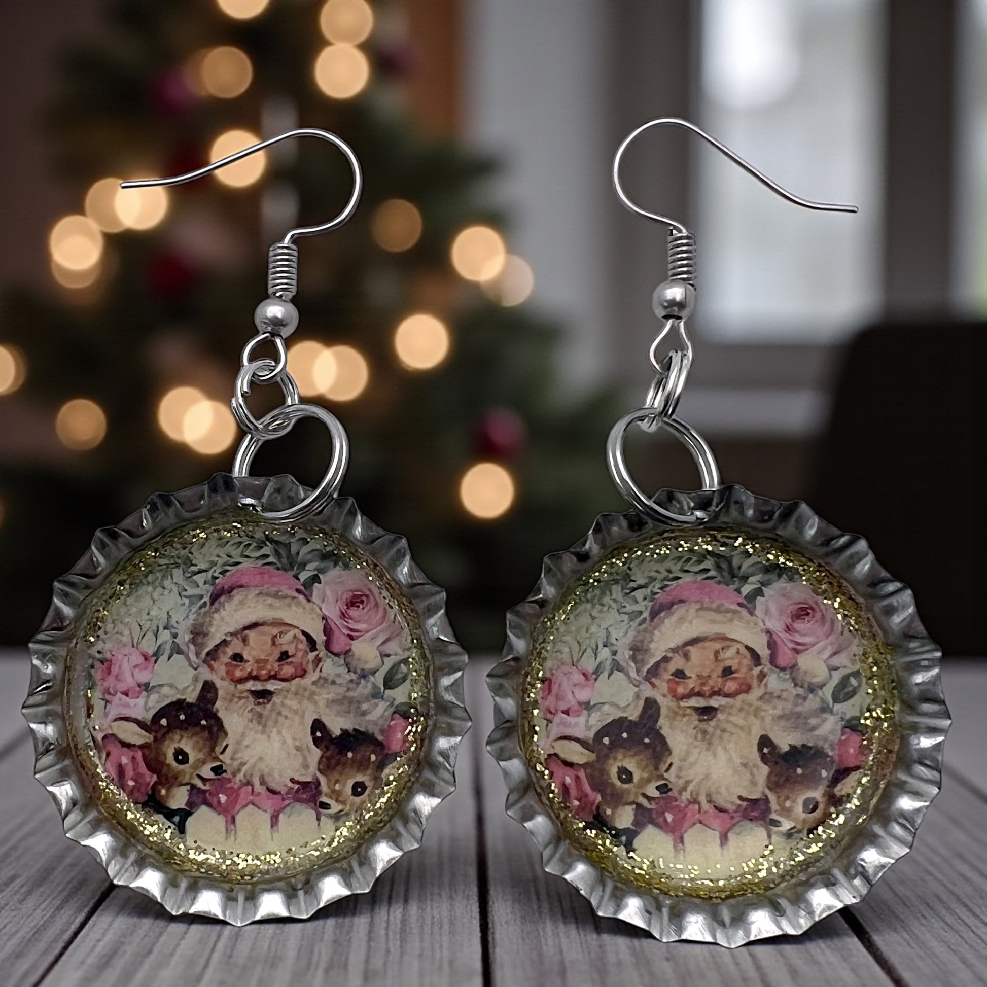 Add some nostalgic sparkle to your holiday look with these handmade Pink Santa & Reindeer Bottle Cap Earrings. Each piece is lovingly crafted from upcycled bottle caps featuring a charming vintage Santa surrounded by pink roses and sweet little reindeer.