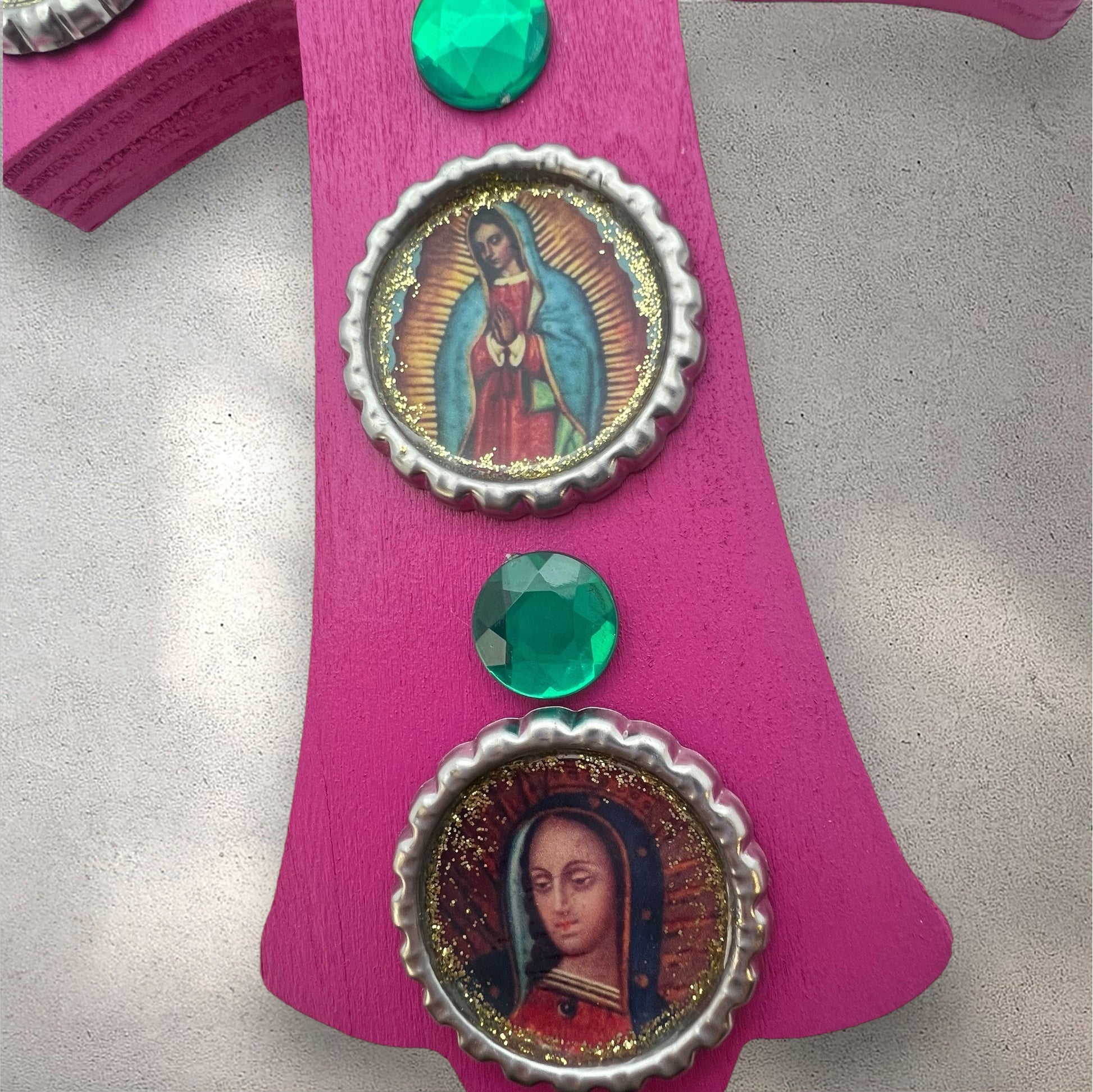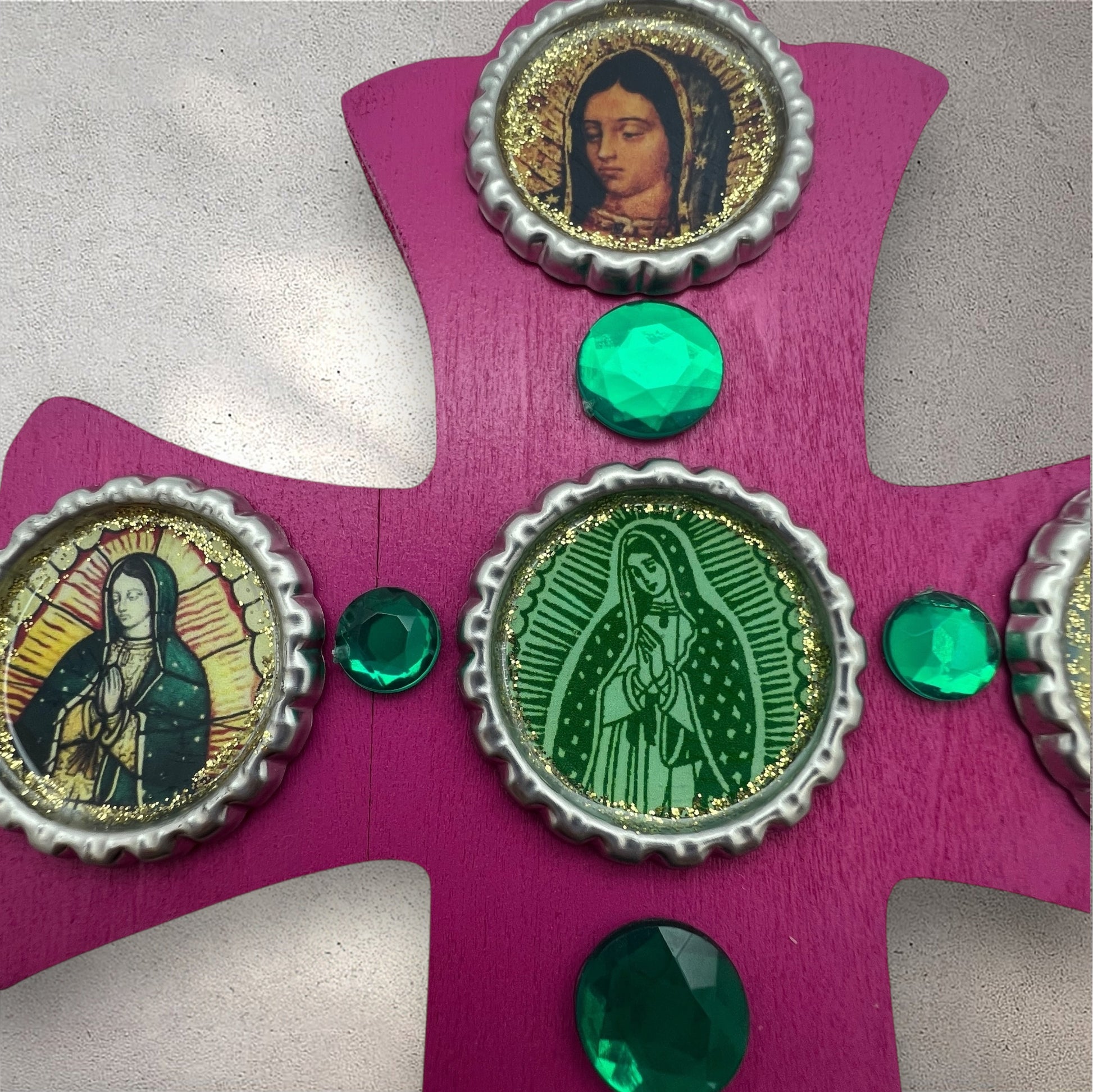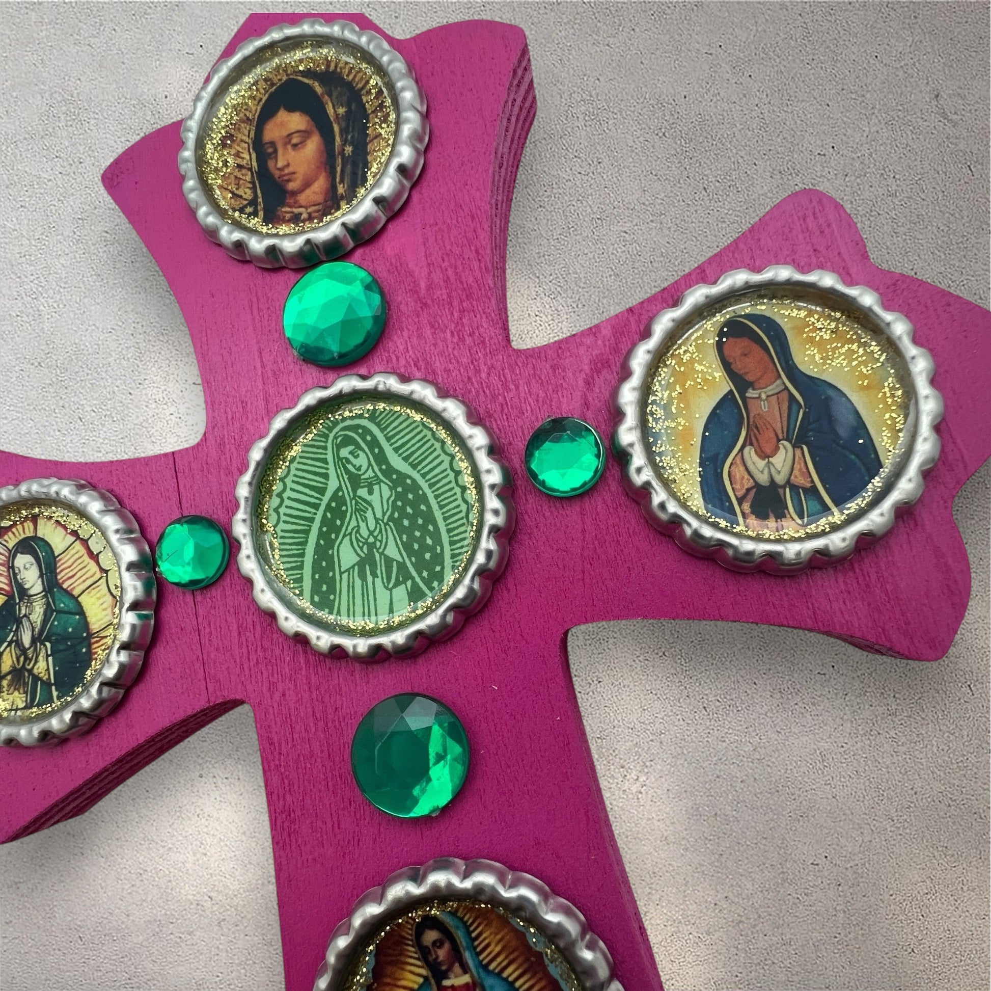 Handmade 8-inch wooden cross painted in vibrant pink, featuring five Virgen de Guadalupe images sealed in resin inside silver bottle caps. Accented with green faux gemstones for extra color and shine.