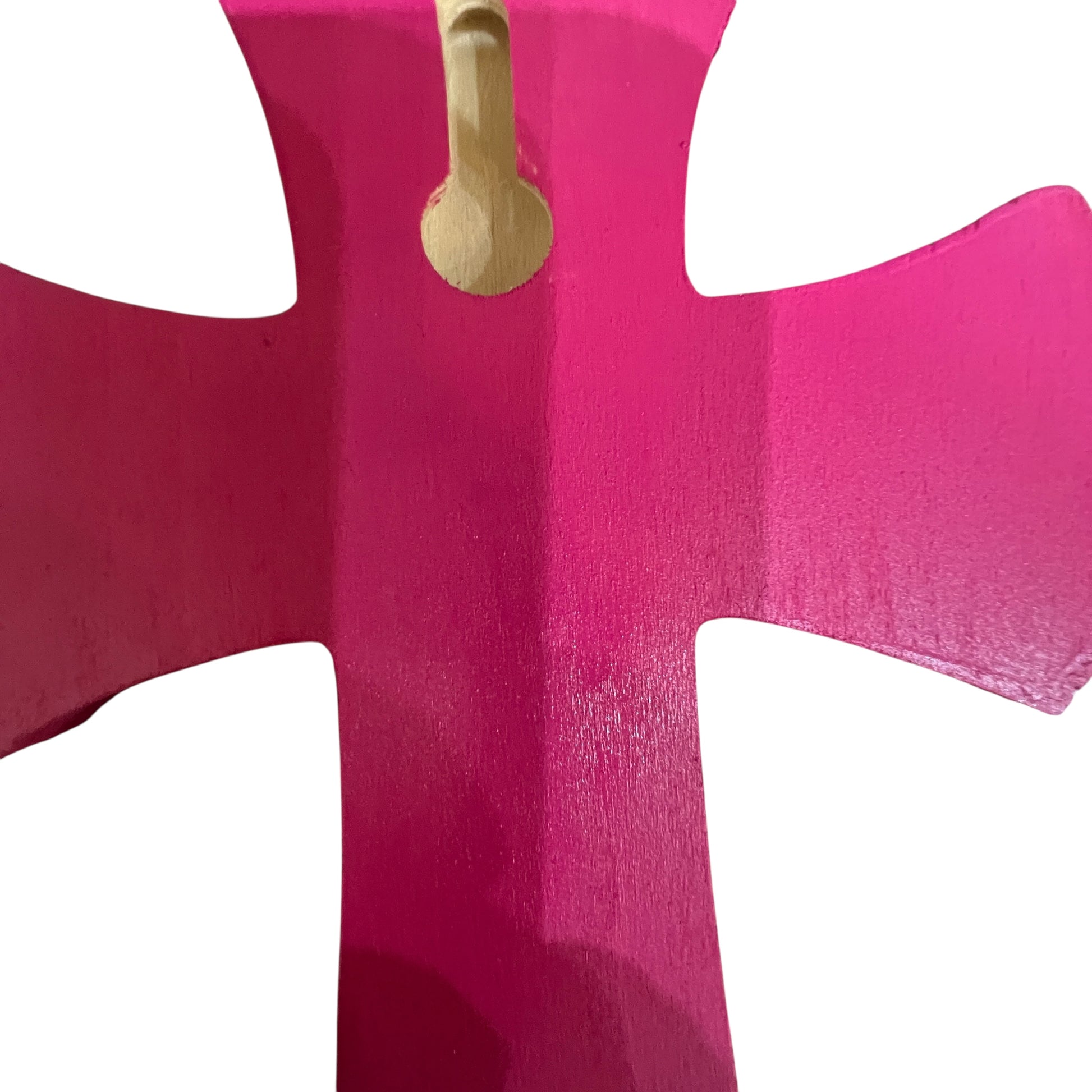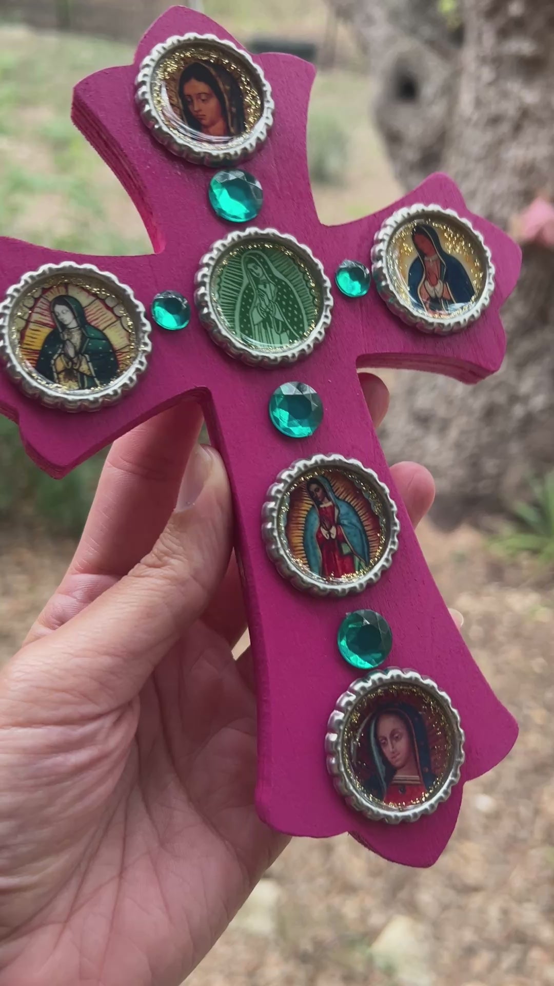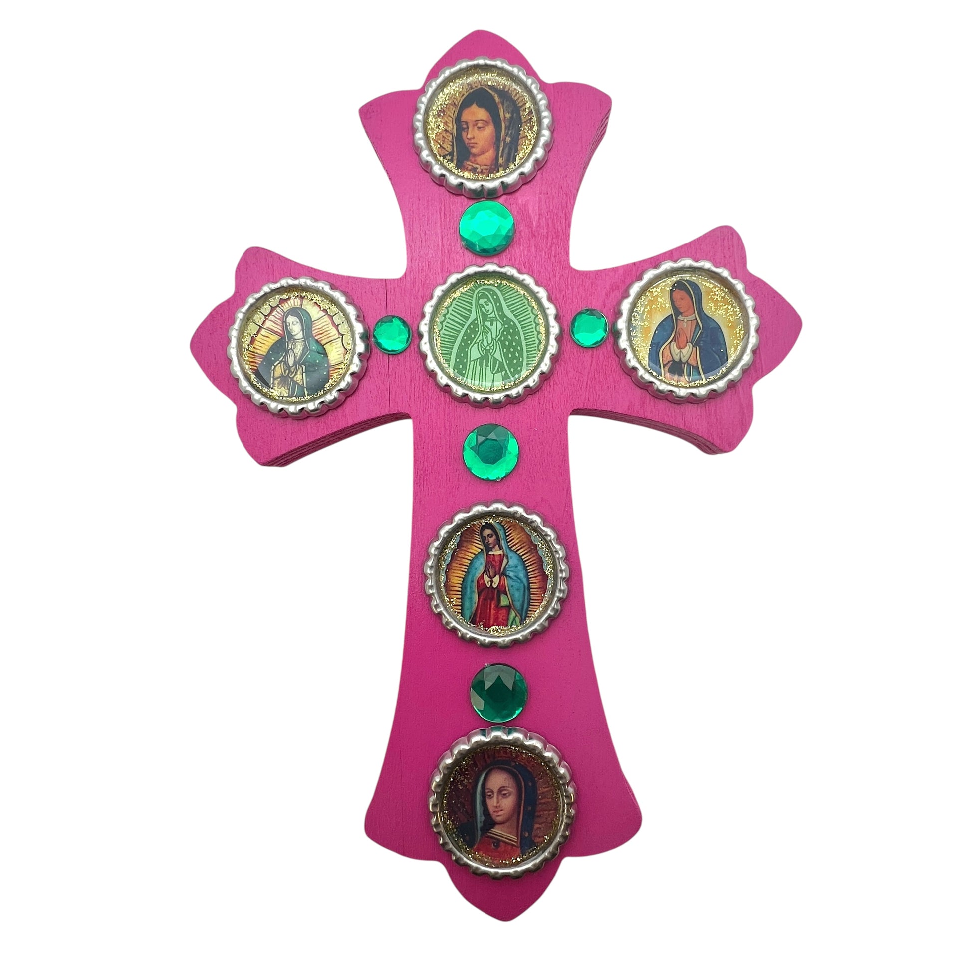Handmade 8-inch wooden cross painted in vibrant pink, featuring five Virgen de Guadalupe images sealed in resin inside silver bottle caps. Accented with green faux gemstones for extra color and shine.