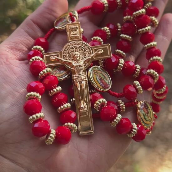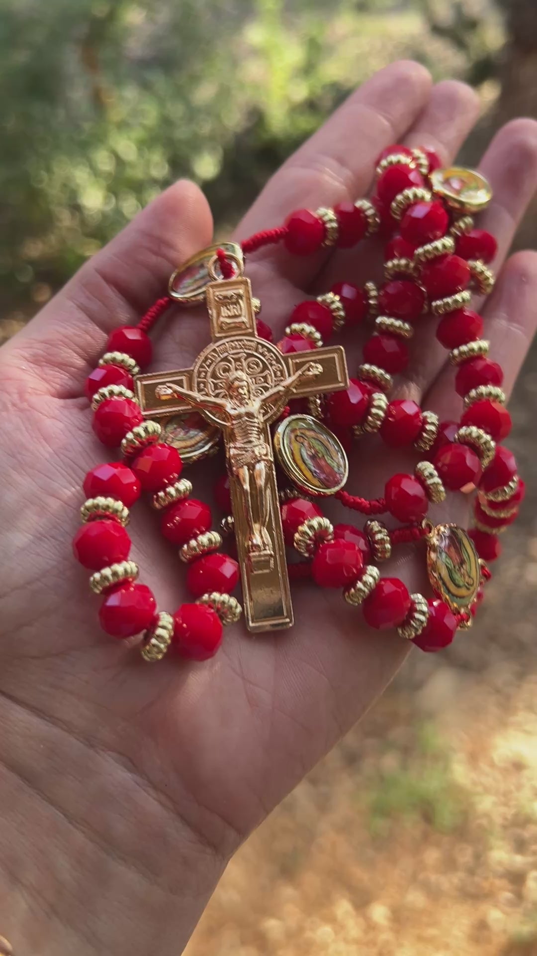 Red Crystal Rosary 21” with Our Lady of Guadalupe Medals & Gold Crucifix