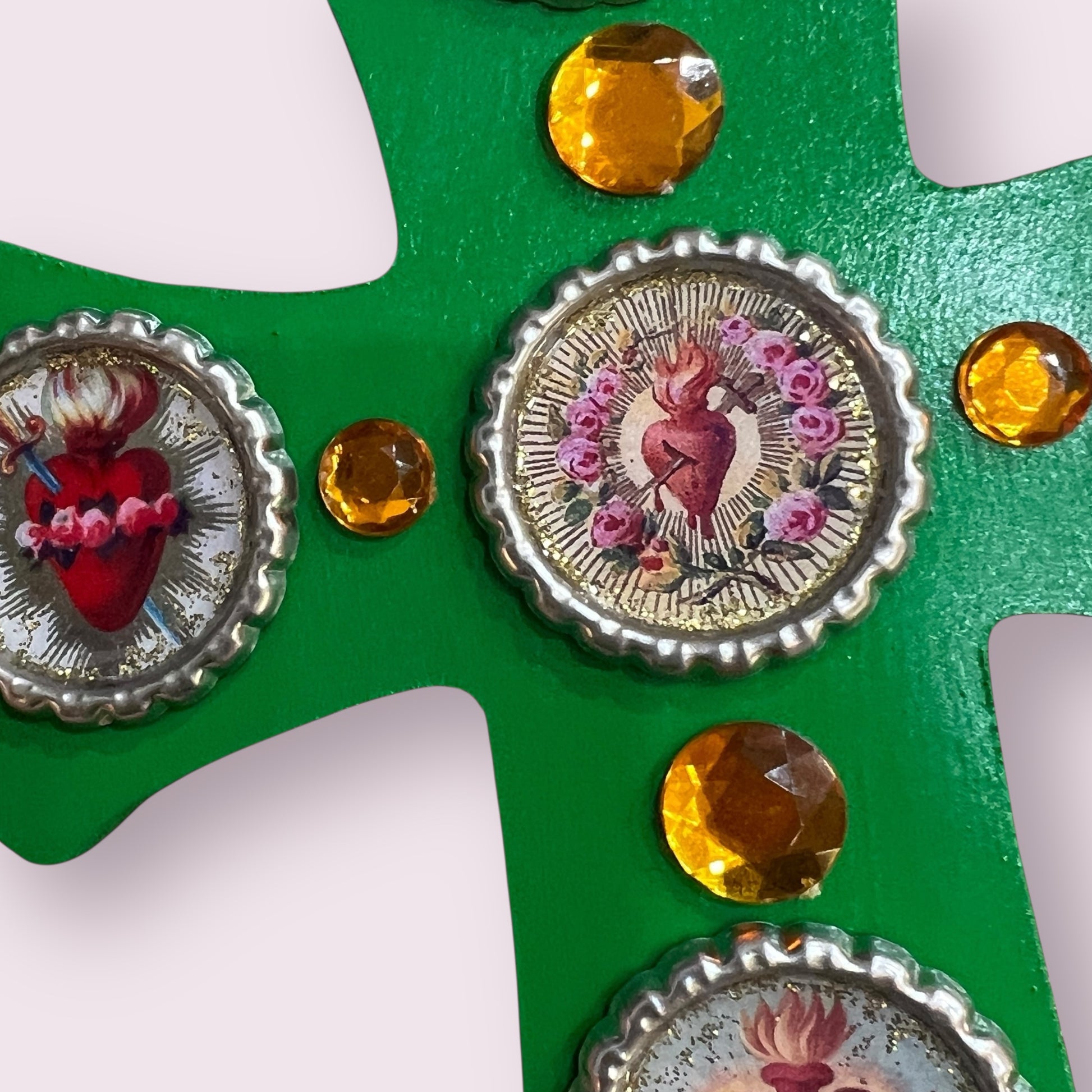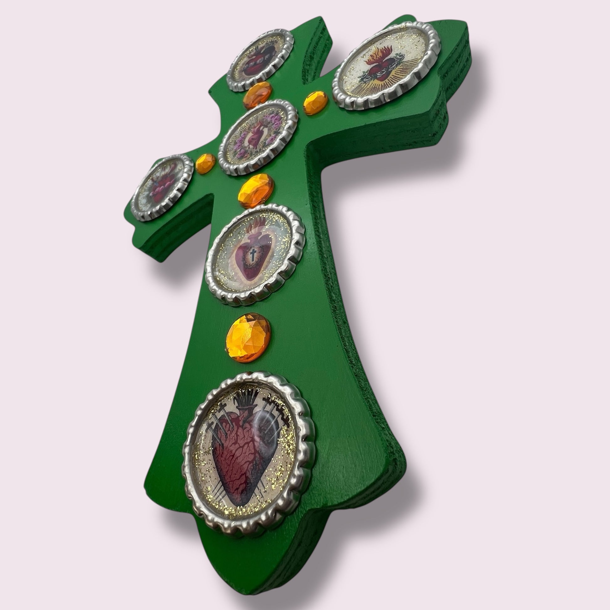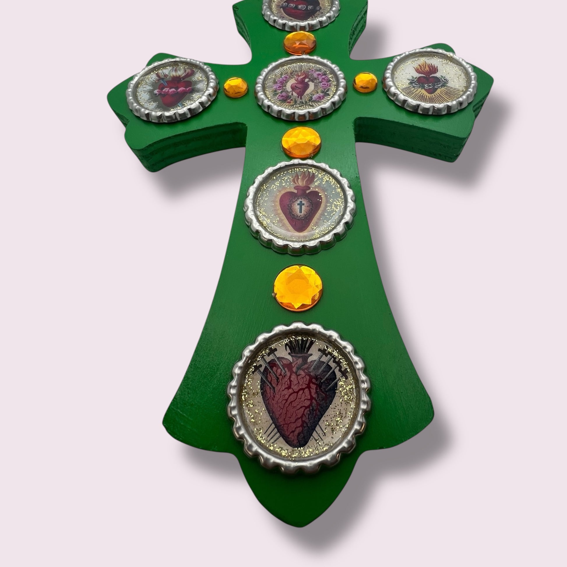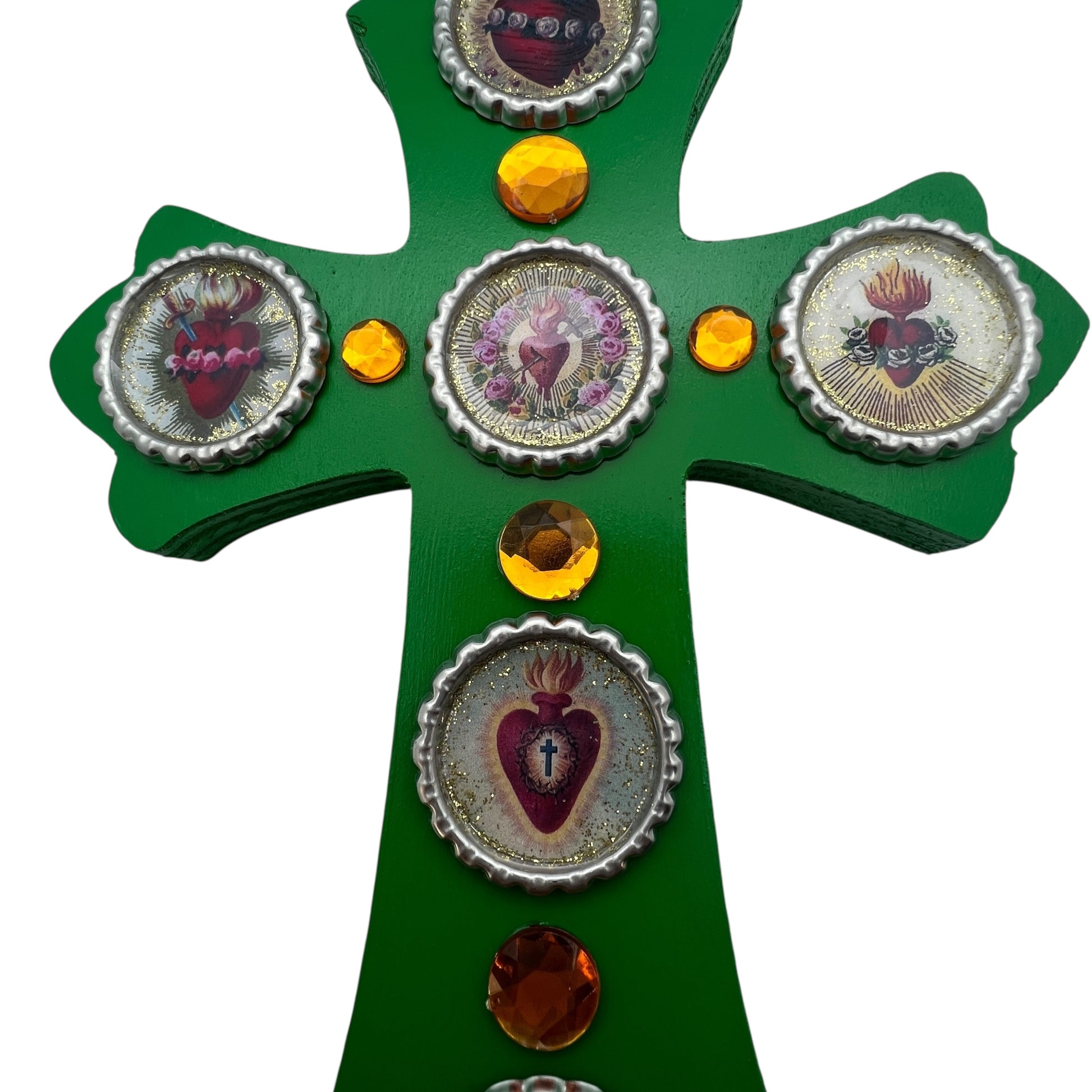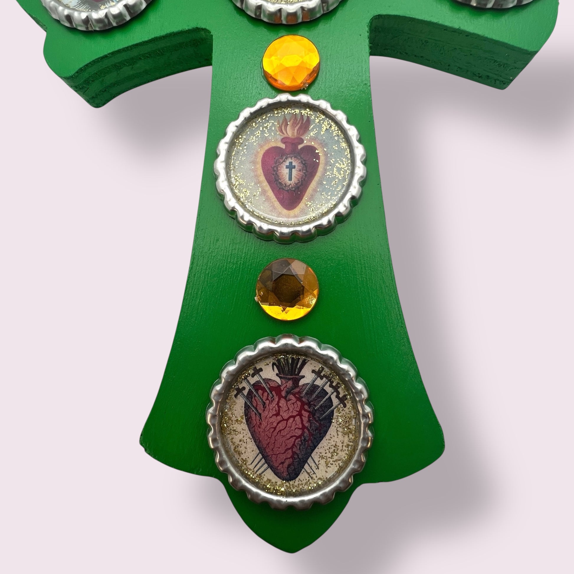 Sacred Heart Wooden Cross – 8” Green Folk Art Cross with Bottle Cap Resin Images & Rhinestones