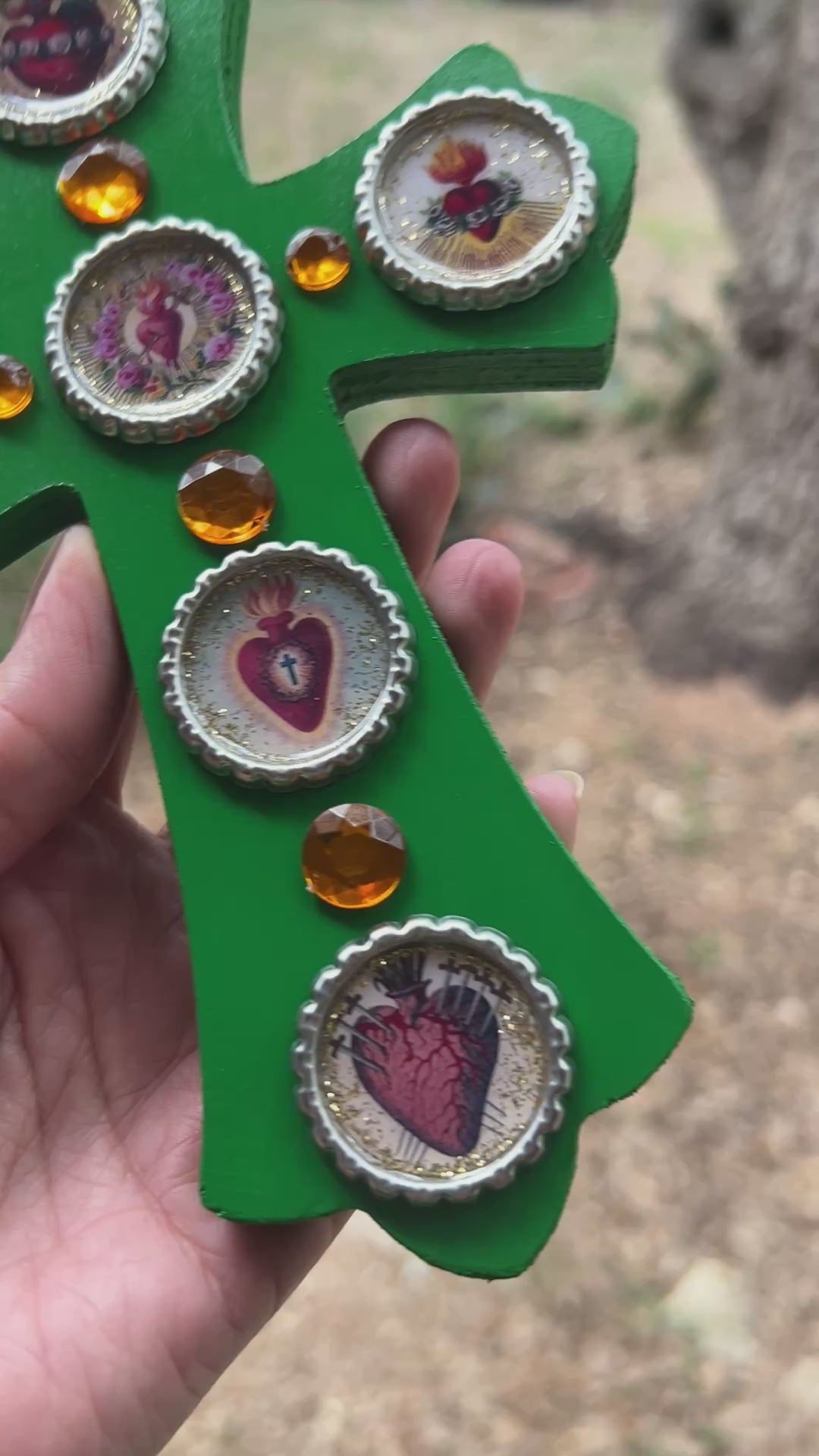 Bring faith and creativity into your space with this handcrafted 8-inch wooden cross. Each Sacred Heart image is carefully placed inside a repurposed bottle cap and sealed in glossy resin for protection and shine. Sparkling amber rhinestones add a radiant touch, while the bold green wood base highlights the vibrant folk art style.