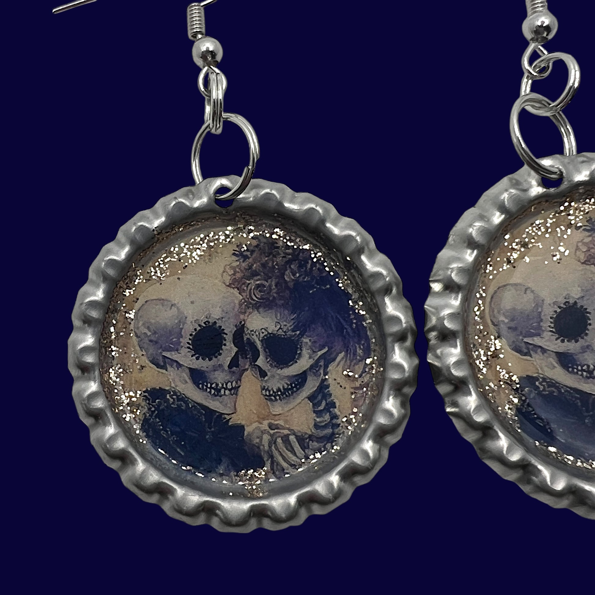 Handcrafted from upcycled bottle caps, each pair features a hauntingly romantic skeleton couple illustration sealed under sparkling resin. The design captures gothic elegance with a touch of macabre charm — perfect for Día de los Muertos, Halloween, or everyday gothic style.