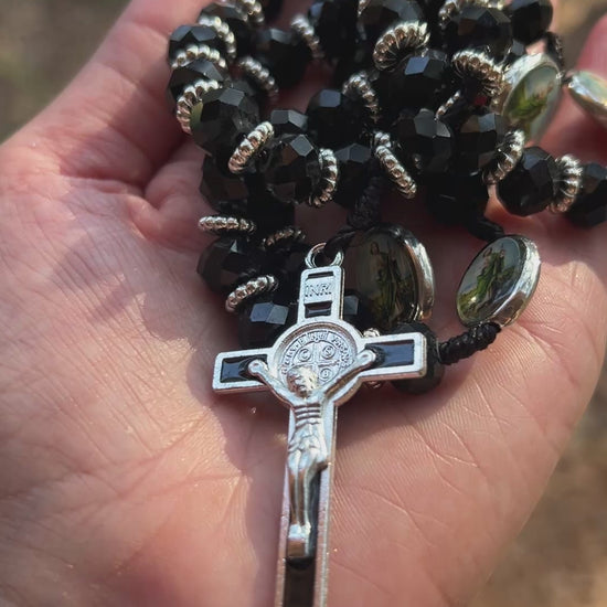 This elegant 19-inch St. Jude rosary is beautifully crafted with black faceted glass beads and silver-tone spacers. Each decade features vivid St. Jude Thaddeus image medallions, symbolizing hope and faith. The rosary is finished with a detailed silver-tone crucifix engraved with INRI, perfect for prayer, meditation, or gifting.