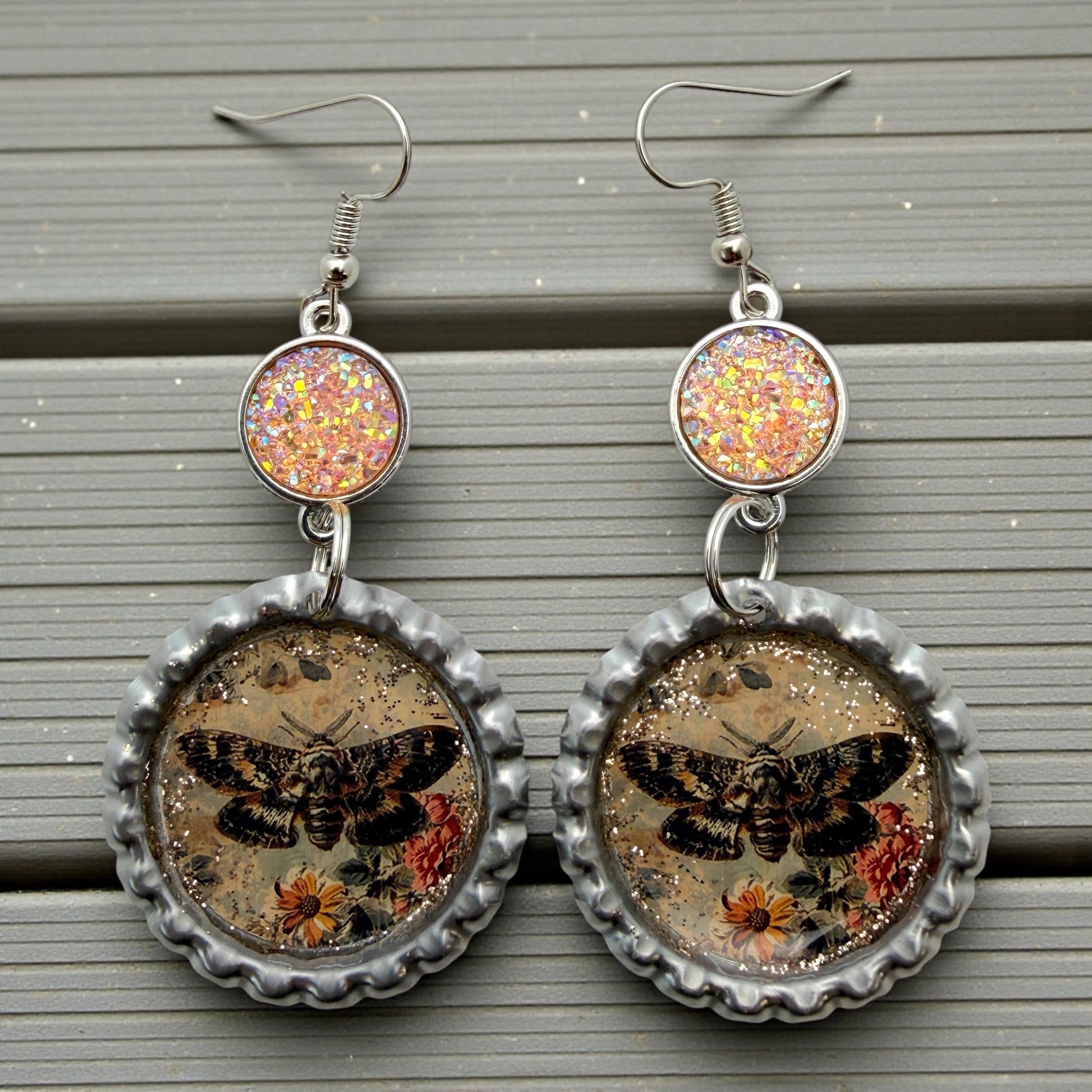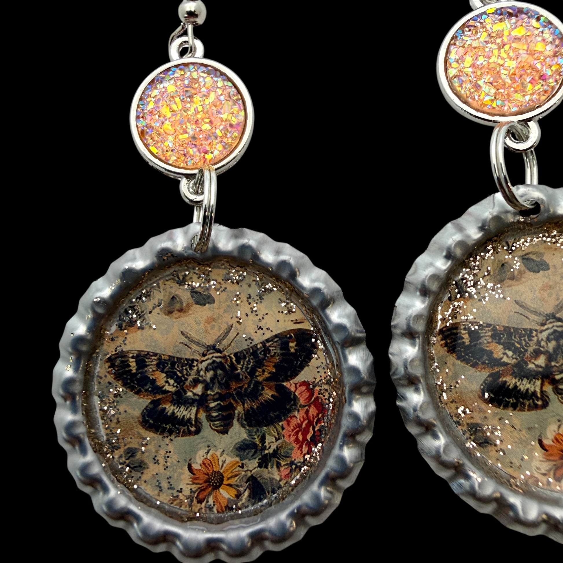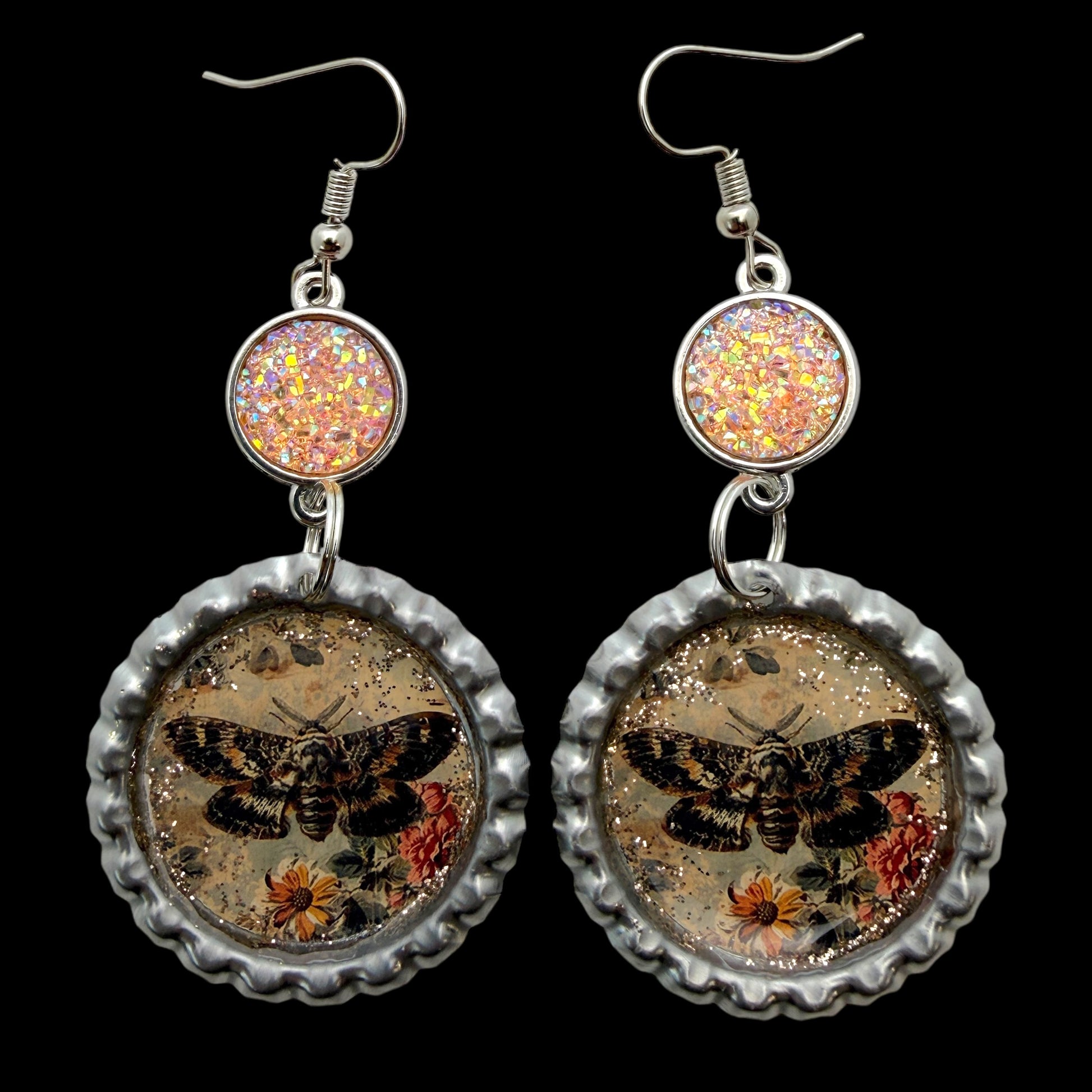 Handmade statement earrings featuring a vintage-style moth over florals, sealed in resin and set inside upcycled silver bottle caps. Finished with a sparkling peach druzy-style connector for a soft shimmer and a gothic-romantic vibe.