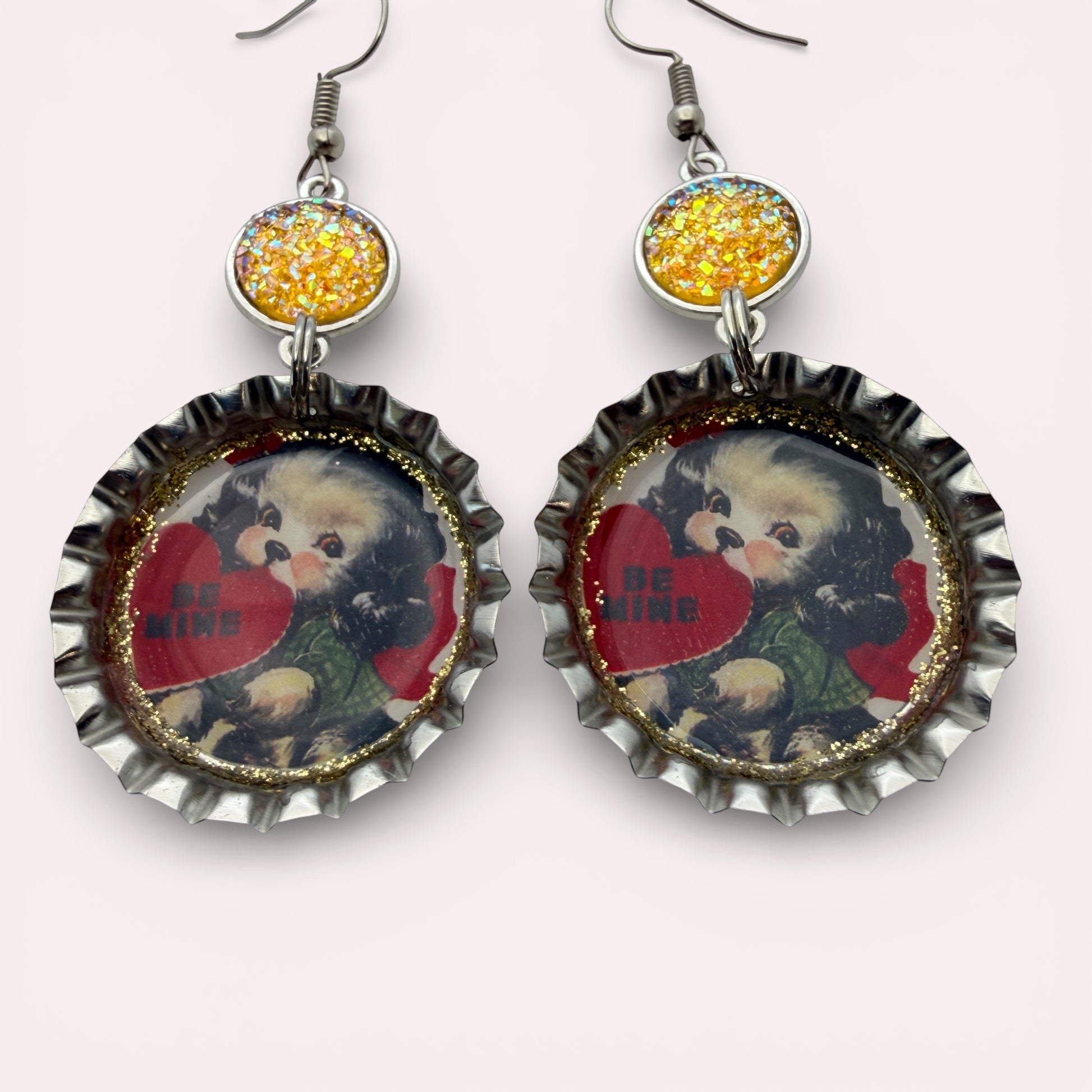 Vintage Valentine Puppy Upcycled Bottle Cap Earrings – Be Mine
