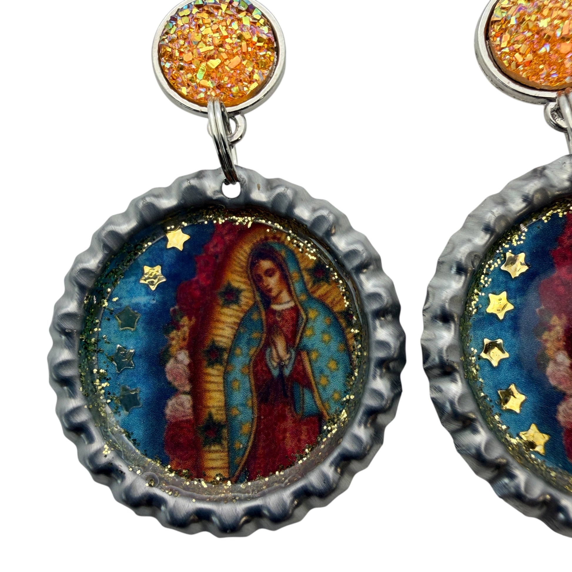 These one-of-a-kind earrings are handcrafted using repurposed bottle caps and sealed with resin for shine and durability. Each pair features a vibrant Virgen de Guadalupe image accented with gold star details and paired with sparkling gold druzy connectors for extra shimmer.