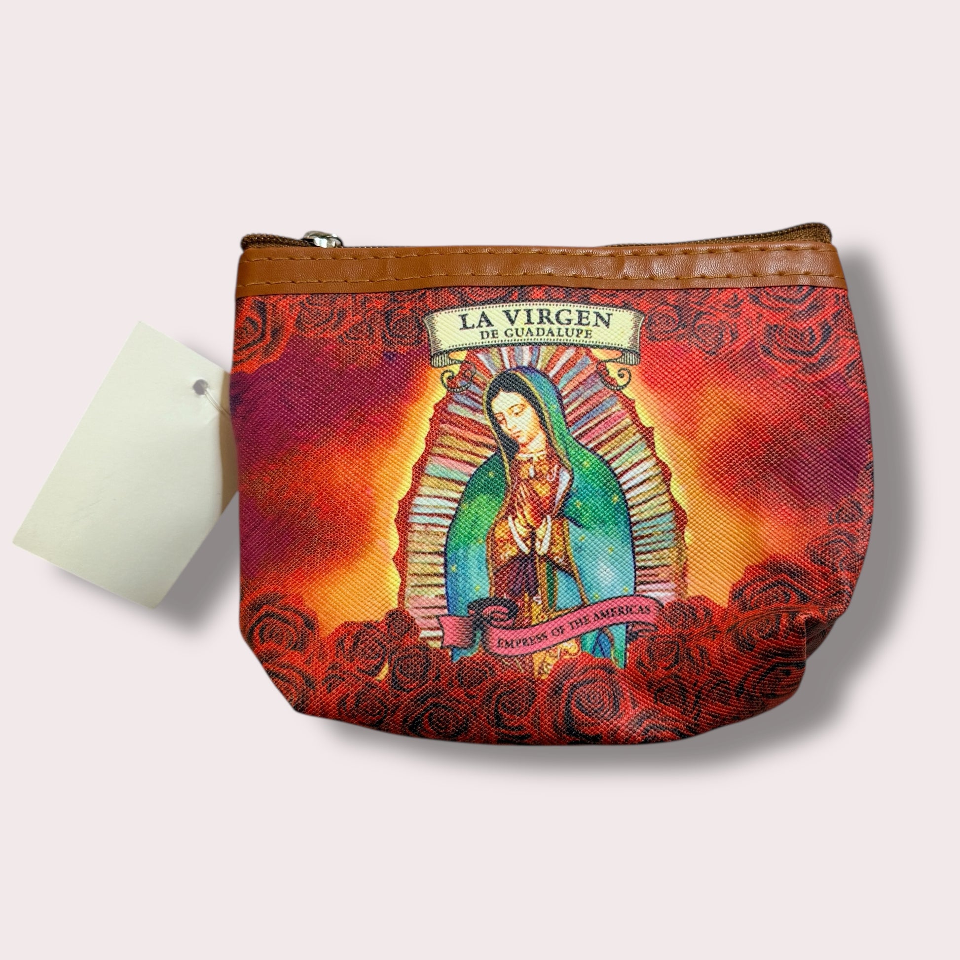 Virgen de Guadalupe Coin Pouch Zip Wallet with Keyring – Red Rose Design