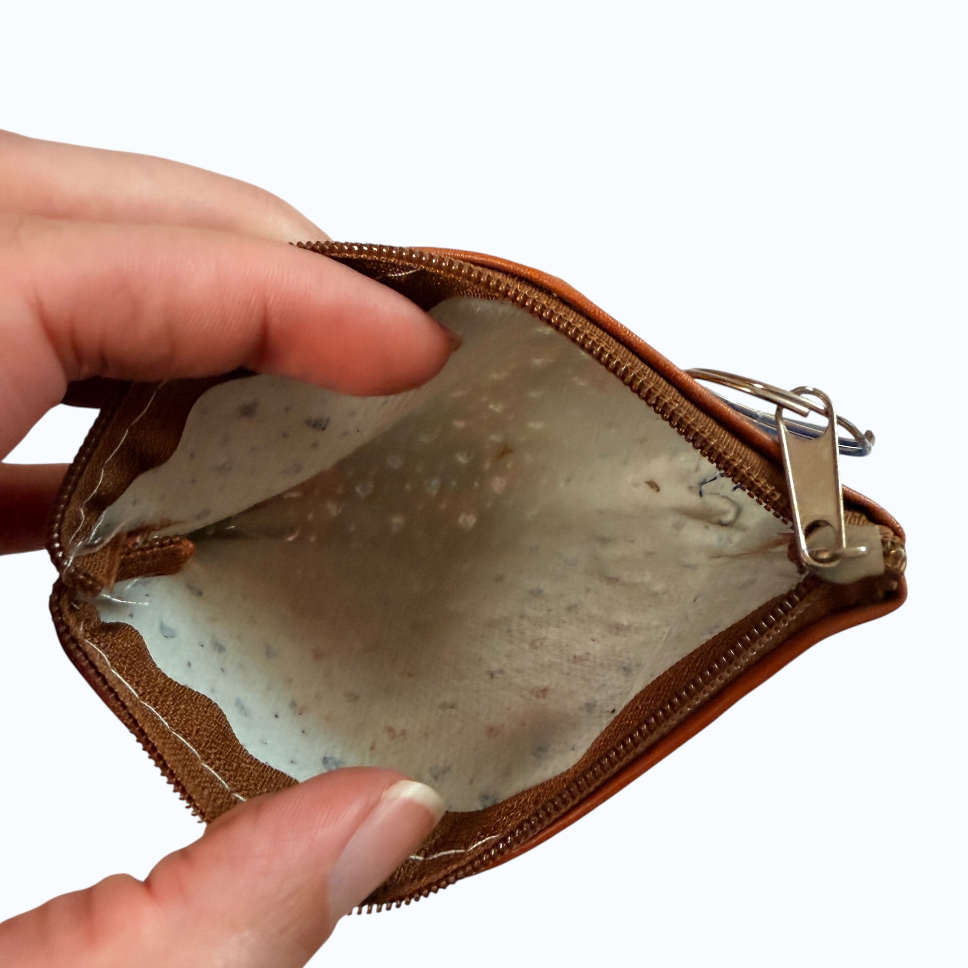 Small coin purse featuring a colorful Virgin Mary / Our Lady of Guadalupe image with sparkling heart stud accents. Compact zipper pouch with attached key ring.